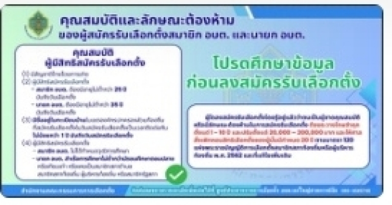 "คุณสมบัติ" ผู้สมัครรับเลือกตั้ง นายกองค์การบริหารส่วนตำบลหรือสมาชิกสภาองค์การบริหารส่วนตำบล ศึกษาเพิ่มเติมได้ที่