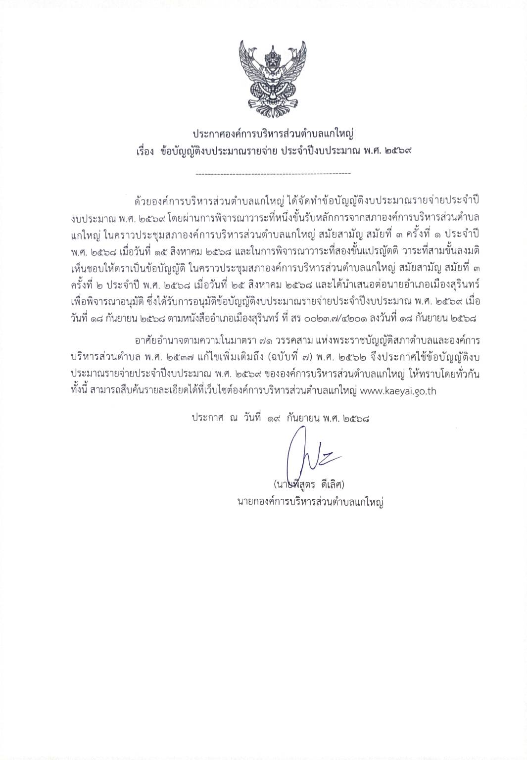 ประกาศองค์การบริหารส่วนตำบลแกใหญ่ เรื่อง ข้อบัญญัติงบประมาณรายจ่ายประจำปีงบประมาณ พ.ศ. 2569 |